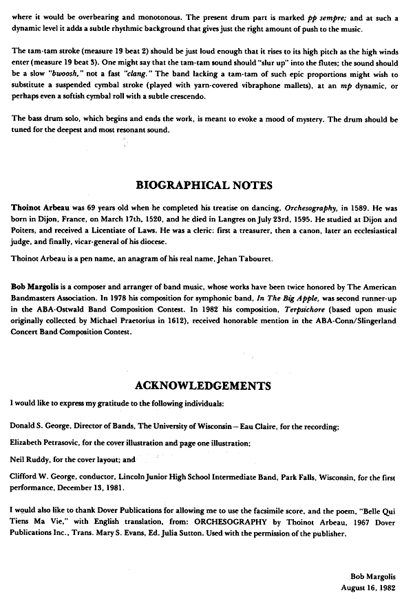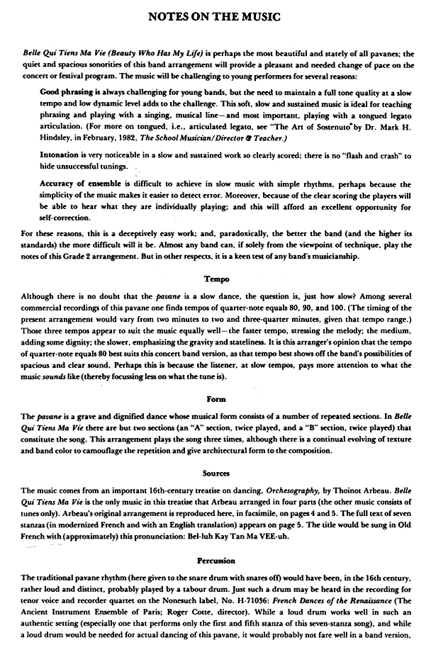 Belle Qui Tiens Ma Vie from Thoinot Arbeau's treatise on dancing, Orchesography (1589), arranged for concert band by Bob Margolis. Suitable for middle school through college bands, 3 minutes duration, Grade 2.